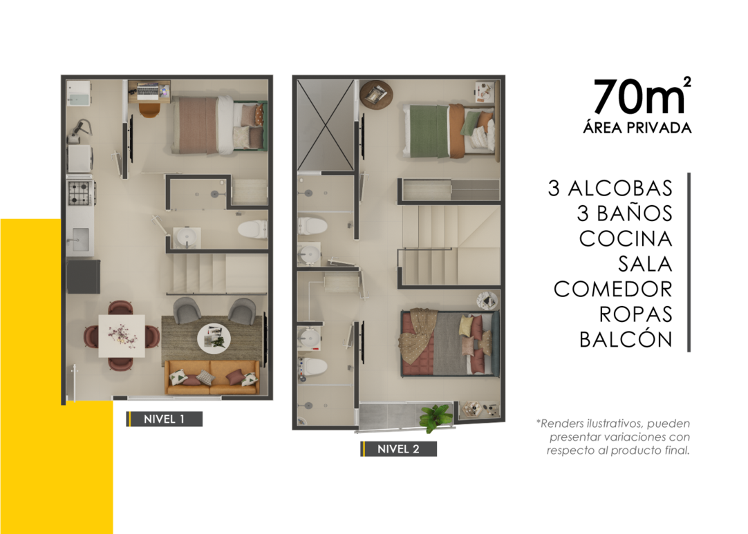 En las casas, desarrollamos un complejo de viviendas de 2 niveles, con 3 habitaciones y 3 baños.